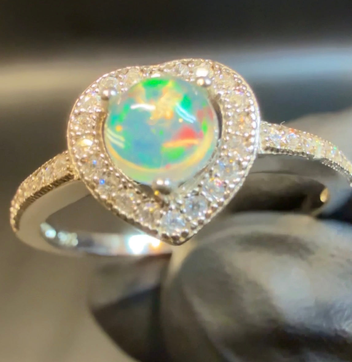 A classic gemstone ring featuring a natural Ethiopian opal with white topaz accents in sterling silver. Timeless design, natural beauty, and ready to wear.